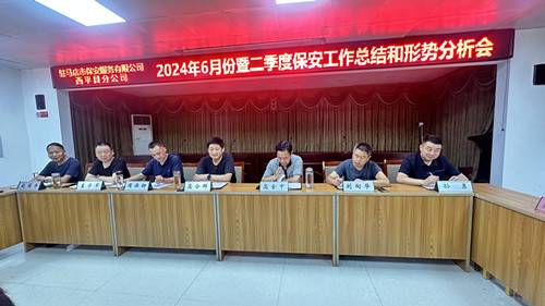 2024年7月23日晚,西平县分公司在公司五楼会议室召开第二度保安工作总结和形势分析会,会议由常务副经理周保卿主持,副经理冀学军通报第二季度人防、物业考核考评和半年客户回访情况,表彰了二季度被评为先进单位和优秀保安队员及好人好事,同时,对存在的问题进行回顾总结,会后,分公司支部书记高合群对当前保安市场及下步工作进行深入分析研究,并结合分公司实际情况进行人事调整,从新布置下半年总体目标任务。
