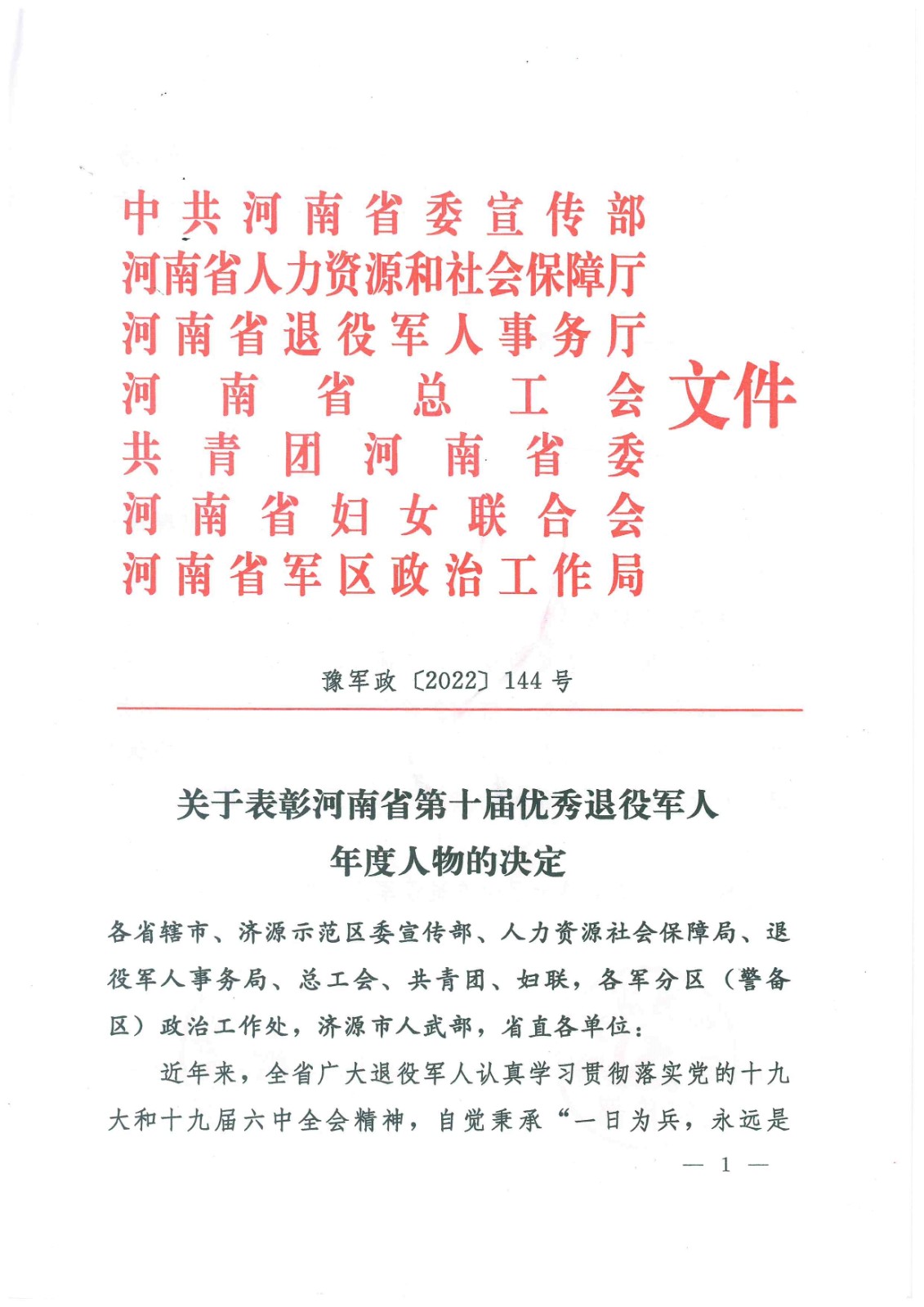 2022年8月1日,在“永远的兵”河南省第十届优秀退役军人年度人物评选表彰活动中,98彩票网(集体)被中共河南省委宣传部、河南省人力资源和社会保障厅、河南省退役军人事务厅、河南省总工会、共青团河南省委、河南省妇女联合会、河南省军区政治工作局表彰为“‘年度人物’提名奖”。